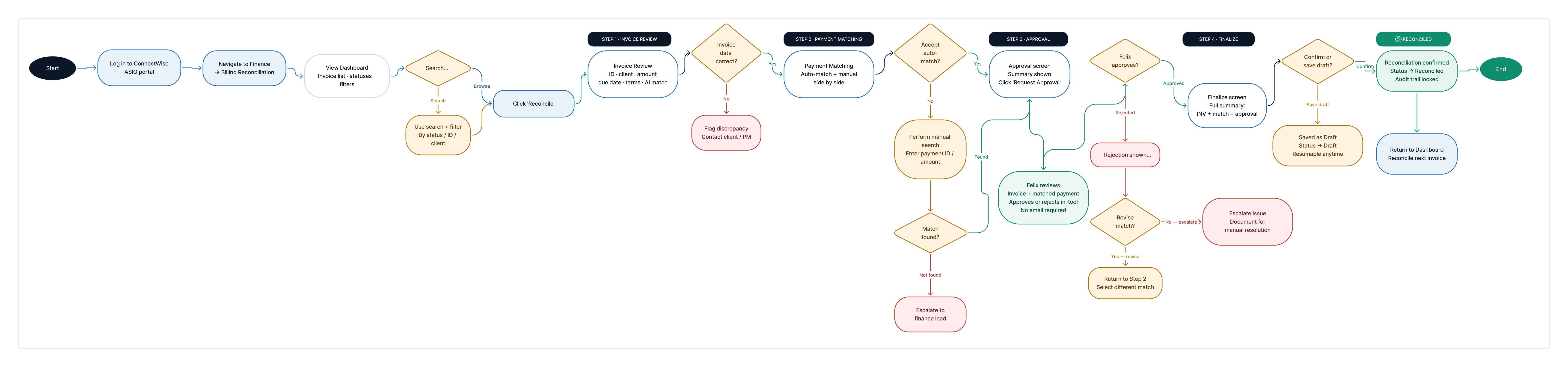 Simplified the workflow into sequential, recoverable stages. Each stage has a clear entry/exit state, preventing mid-flow confusion and creating a full audit trail per invoice.