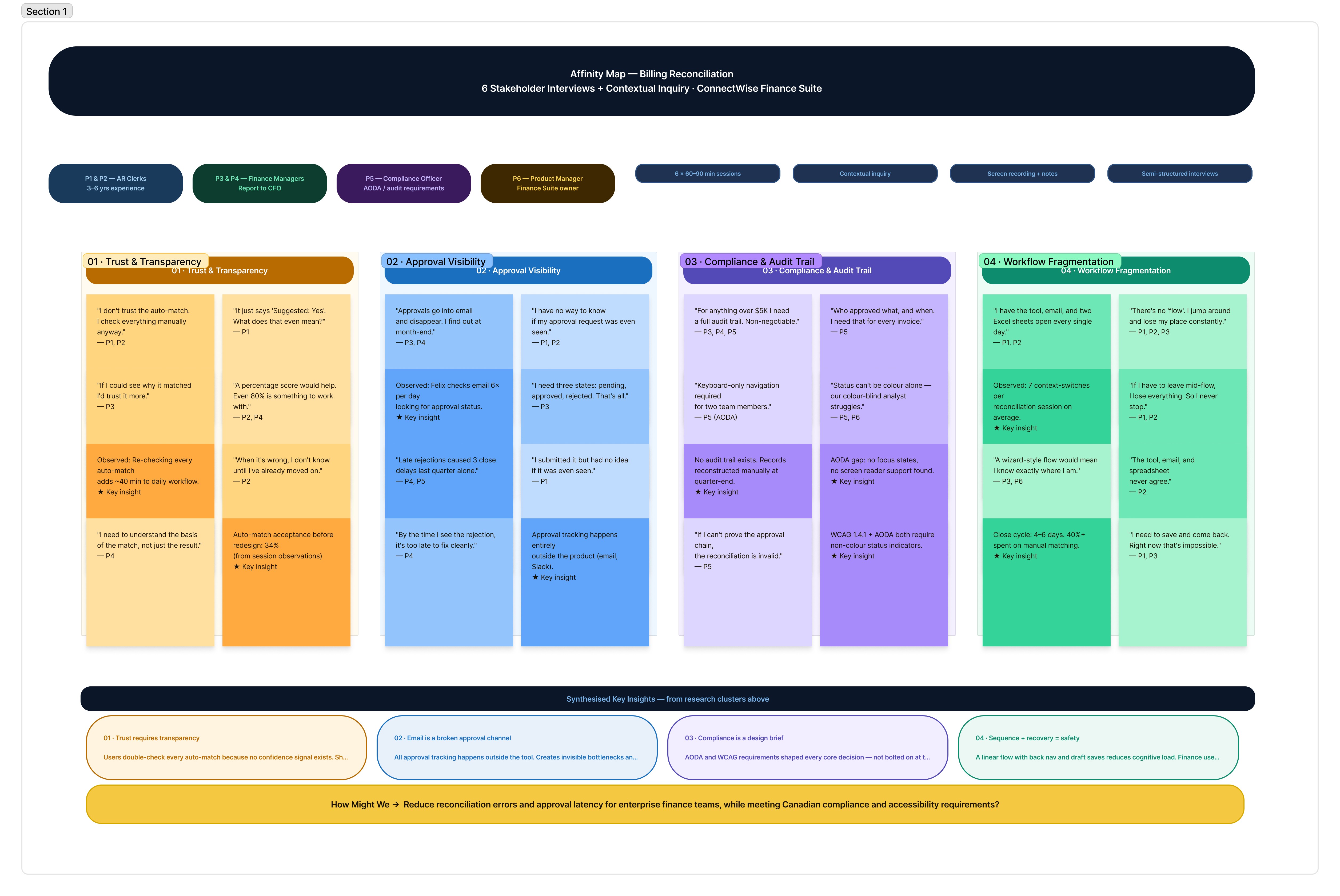 Key method: contextual inquiry, observed live reconciliation sessions to capture workarounds.